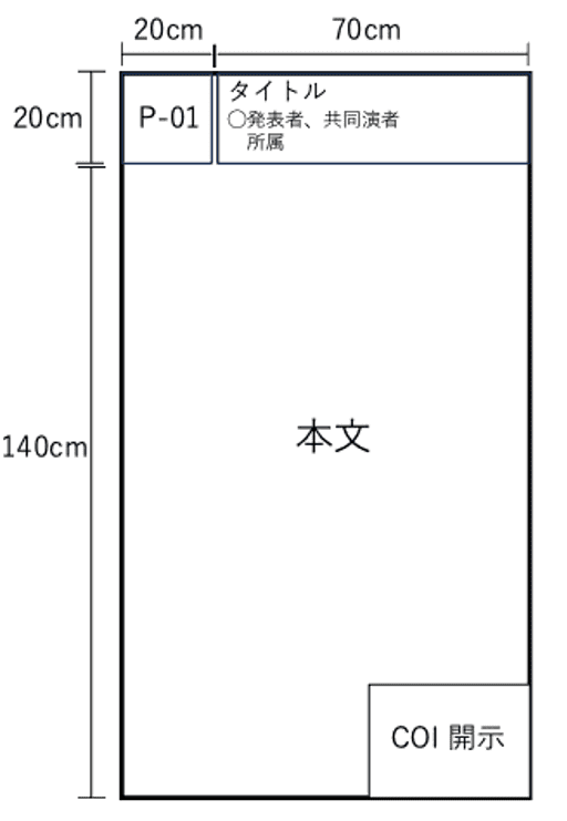左上の演題番号(20cm×20cm)は事務局で準備しますが、演題名・発表者名・所属の表示(縦20cm×横70cm)は、各自ご準備ください。