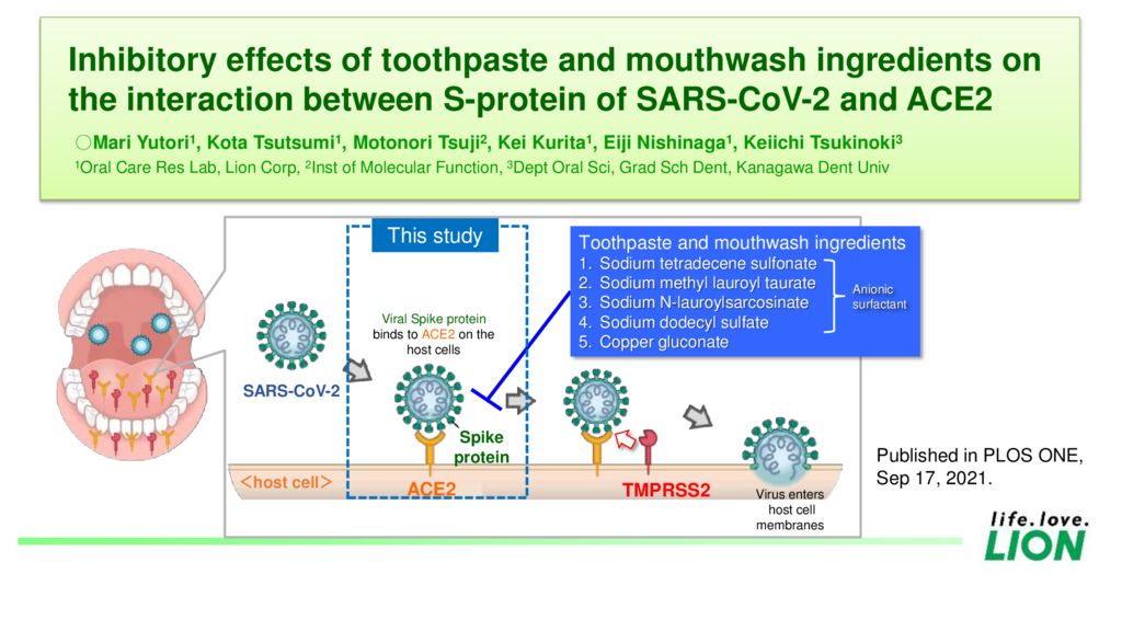Abstract: “【目的】新型コロナウイルス (SARS-CoV-2) は、ウイルスのSタンパクが宿主のアンギオテンシン変換酵素2 (ACE2) に結合した後、宿主の2型膜貫通型セリンプロテアーゼ (TMPRSS2) の活性化を介して細胞内へ侵入する。口腔粘膜 (歯肉・舌) にはACE2及びTMPRSS2が発現しており1),2)、感染経路の1つとして考えられる。そこで市販の歯磨剤及び洗口剤のSARS-CoV-2感染経路阻害ポテンシャルを明らかにするため、本研究では歯磨剤及び洗口剤に一般的に含まれる各成分のSタンパク-ACE2結合阻害作用について評価を実施した。
