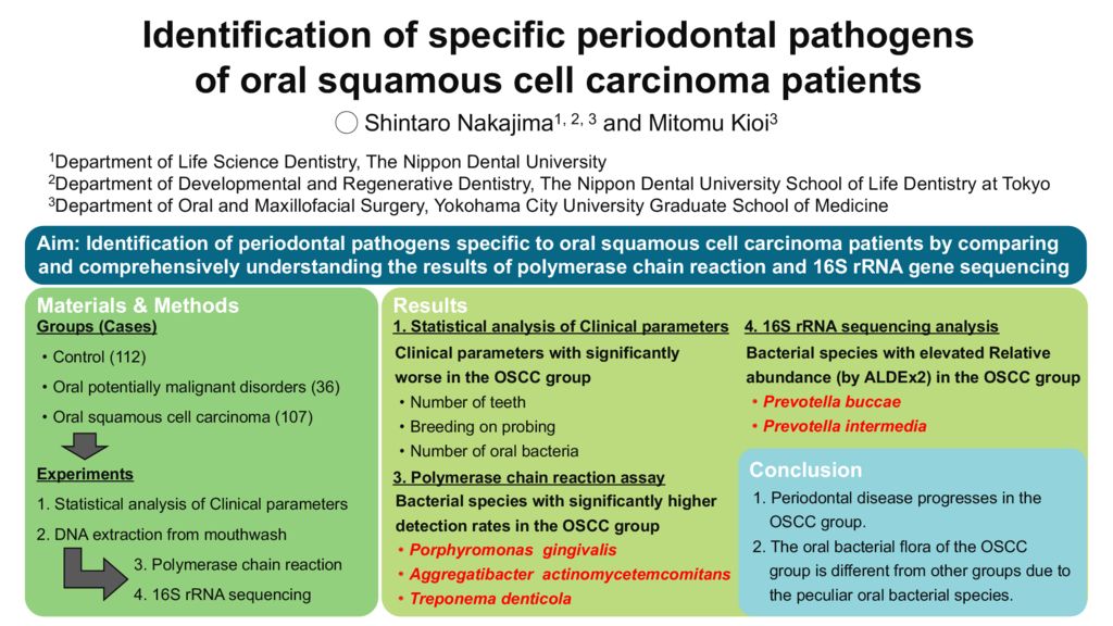 Abstract: 【背景・目的】病原体の感染による慢性炎症は、発癌のリスクを高めることが知られている。歯周病原菌の感染による慢性炎症性疾患である歯周病も、発癌に関与する可能性があるが、口腔内環境に常に暴露されている口腔癌をはじめ、両疾患の直接的な関連は明らかではない。我々は、特定の歯周病原菌の感染が口腔扁平上皮癌(OSCC)の発症や増悪に関連していると仮説を立て、OSCC患者の口腔内に存在する特徴的な歯周病原菌を同定することを目的に本研究を行った。