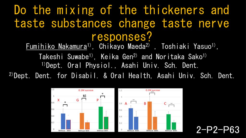 Abstract: 嚥下機能の補助として、食品に増粘剤を添加することは臨床上よく行われている。我々は、4基本味物質を代表的なchemical gradeの増粘剤であるキサンタンガム、グアガム、ペクチン(すべて0.3%)に溶かしたときの嗜好性の変化をラットを用いた行動学的研究により解析し、その嗜好性には、味質と添加した増粘剤の種類により様々なバリエーションが認められることを昨年の本大会にて報告した。本研究では、これらの増粘剤への基本味物質(0.1M NaCl、0.1M ショ糖、3mM HCl、1mM塩酸キニーネ)の混合が、味覚神経応答にも変化をもたらすかどうかを、ラットの鼓索神経応答を電気生理学的に記録することにより検討した。また、chemical gradeの増粘剤とは別に、3種類の市販増粘剤を用いた場合でも同様の検討を行い、その結果を比較した。市販増粘剤の濃度は「摂食・嚥下リハビリテーション学会分類2013(とろみ)早見表」に基づき「濃いとろみ」相当に統一した。