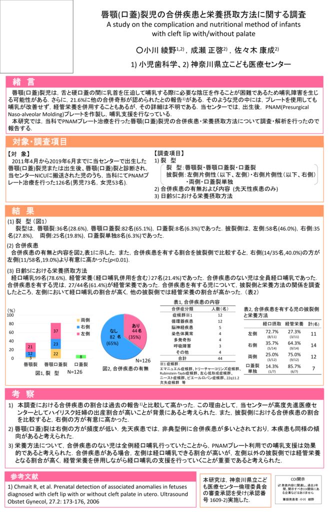 Abstract:【緒言】唇顎(口蓋)裂児は哺乳障害を生じる可能性が高い。そのため当センターでは、出生後PNAM(PresurgicalNaso-alveolarMolding)プレートを作製し、哺乳支援を行っている。本研究では、当科でPNAMプレート治療を行った唇顎(口蓋)裂児の合併疾患・栄養摂取方法について検討を行ったので報告する。【対象と方法】対象は、2011年4月から2019年6月までに当科にてPNAMプレート治療を行った126名。調査項目は、裂型、合併疾患の有無および内容、日齢5における栄養摂取方法、とした。【結果と考察】裂型は、唇顎裂:28.6%、唇顎口蓋裂:65.1%、口蓋裂:6.3%であった。披裂は、左側片側性(以下、左側):46.0%、右側片側性(以下、右側):27.8%、両側:19.8%、口蓋裂単独:6.3%であった。合併疾患は、34.9%の児が有しており、過去の報告と比較して高かった。この理由として、当センターが高度先進医療センターとしてハイリスク妊婦の出産割合が高いことが背景にあると考えられた。合併疾患の内容は、循環器疾患・染色体異常・呼吸障害・消化器疾患等、多岐に渡っていた。また、披裂で比較すると、右側の方が左側より合併疾患を有する割合が有意に高かった(p<0.01)。唇顎(口蓋)裂は右側の方が頻度が低い。先天疾患において、非典型例とされるタイプには合併疾患が多いとされており、本疾患も同様のメカニズムが考えられた。栄養摂取方法は、経口哺乳:78.6%、経管栄養(経口哺乳併用を含む):21.4%であった。合併疾患を有する児は,左側において経口哺乳の割合が高く、他の披裂では経管栄養の割合が高かった。また、合併疾患のない児は全員経口哺乳を行っていたことから、PNAMプレートを使用しての哺乳支援は効果的であると考えられた。