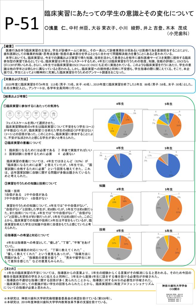 教育 [P-51] 臨床実習にあたっての学生の意識とその変化について Author:〇浅里仁、井上吉登、大谷茉衣子、中村州臣、小川綾野、木本茂成 Affiliation:小児歯科 Abstract:[目的]臨床実習を行うにあたり、学生の意識は他の学年とは明らかに異なっていると思われる。しかし、臨床実習への期待... 教育