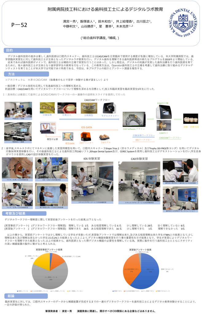 教育 [P-52] 附属病院における歯科技工士によるデジタルラボ教育 Author:〇清宮一秀1、飯塚 直人1、鈴木和也1、井上絵理香1、古川辰之1、中静利文1、山谷勝彦1、星憲幸2、木本克彦2 Affiliation:1総合歯科学、2補綴 Abstract:【目的】 デジタル歯科技術の進歩は著しく,歯科医師... 教育